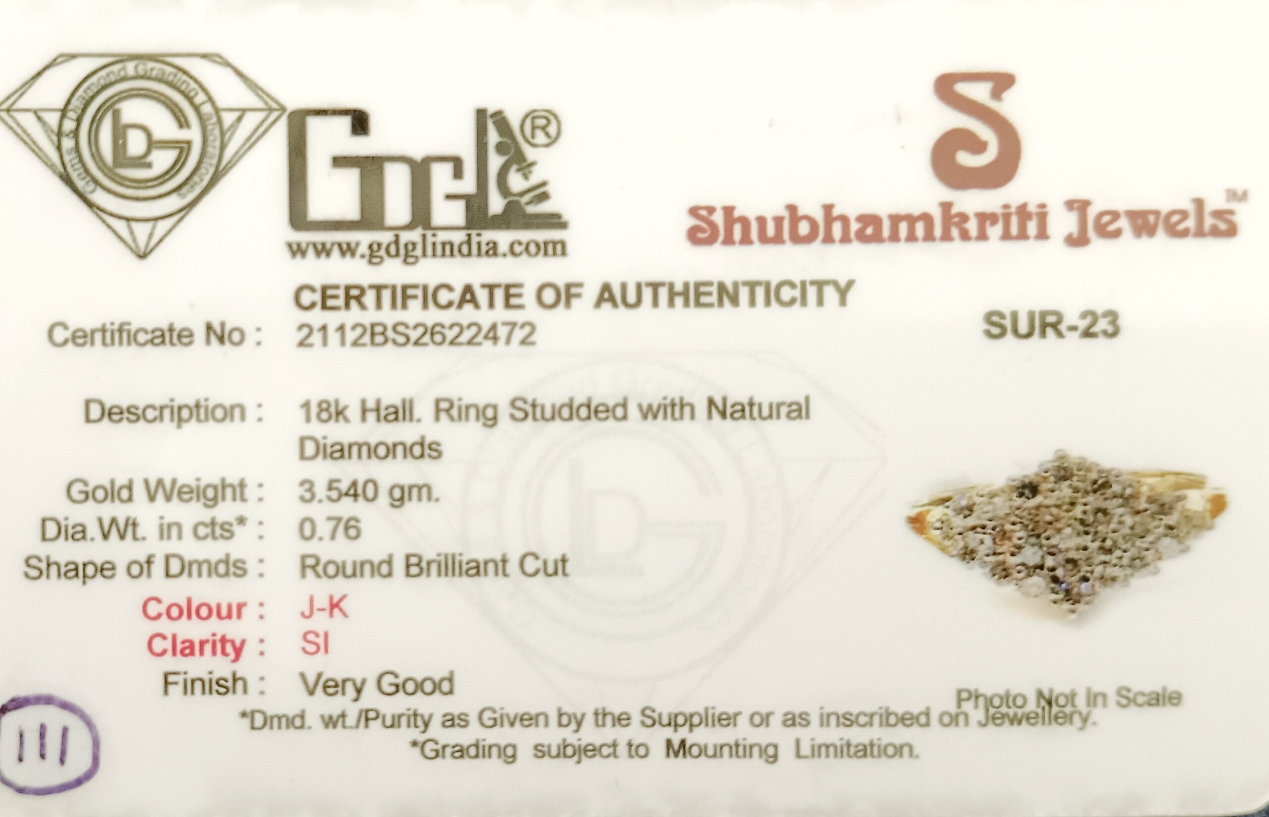 Its beautiful Diamond ring. 18k hallmarked Ring studded with natural Diamonds certified by GDGL (GEMS AND DIAMOND GRADING LABORATORIES)