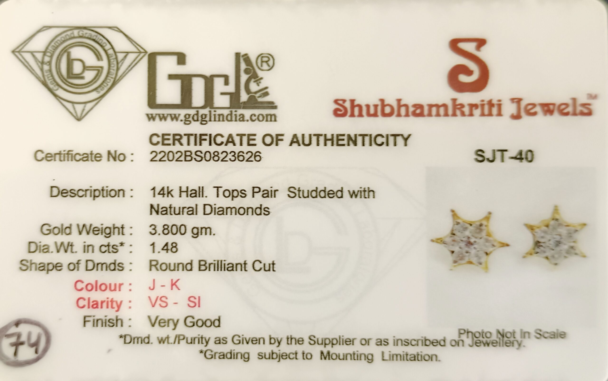 Its 14k Hallmarked Tops pair studded with natural Diamonds certified by GDGL (GEMS AND DIAMOND GRADING LABORATORIES)
