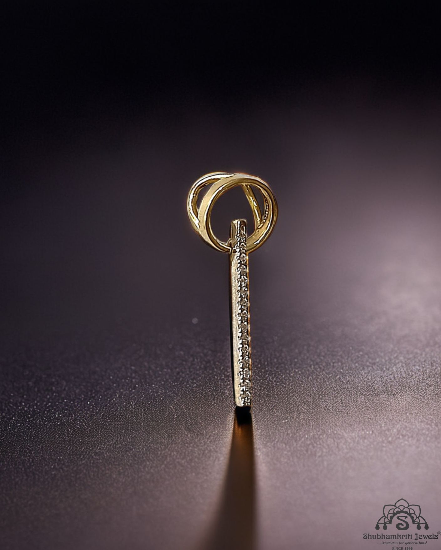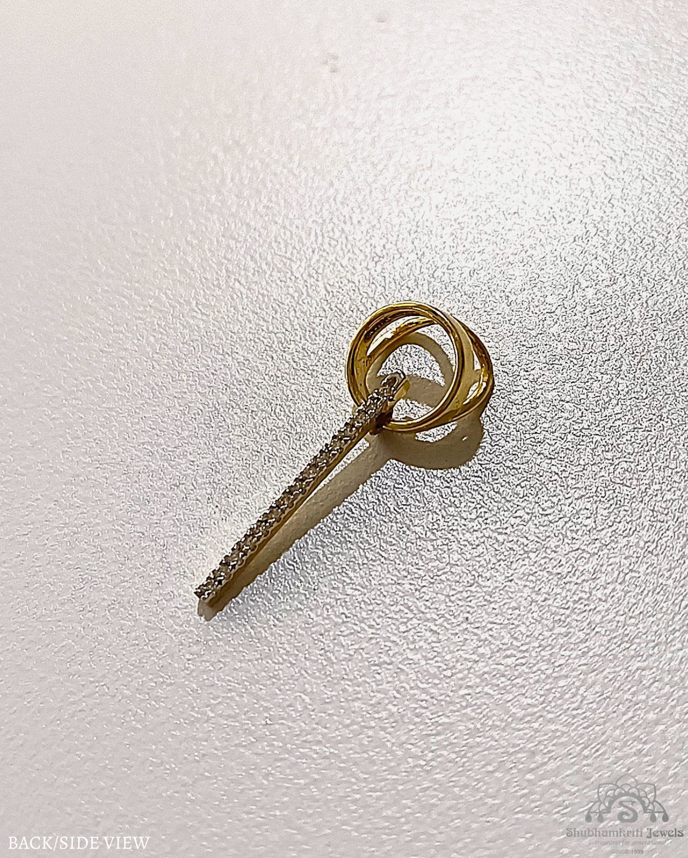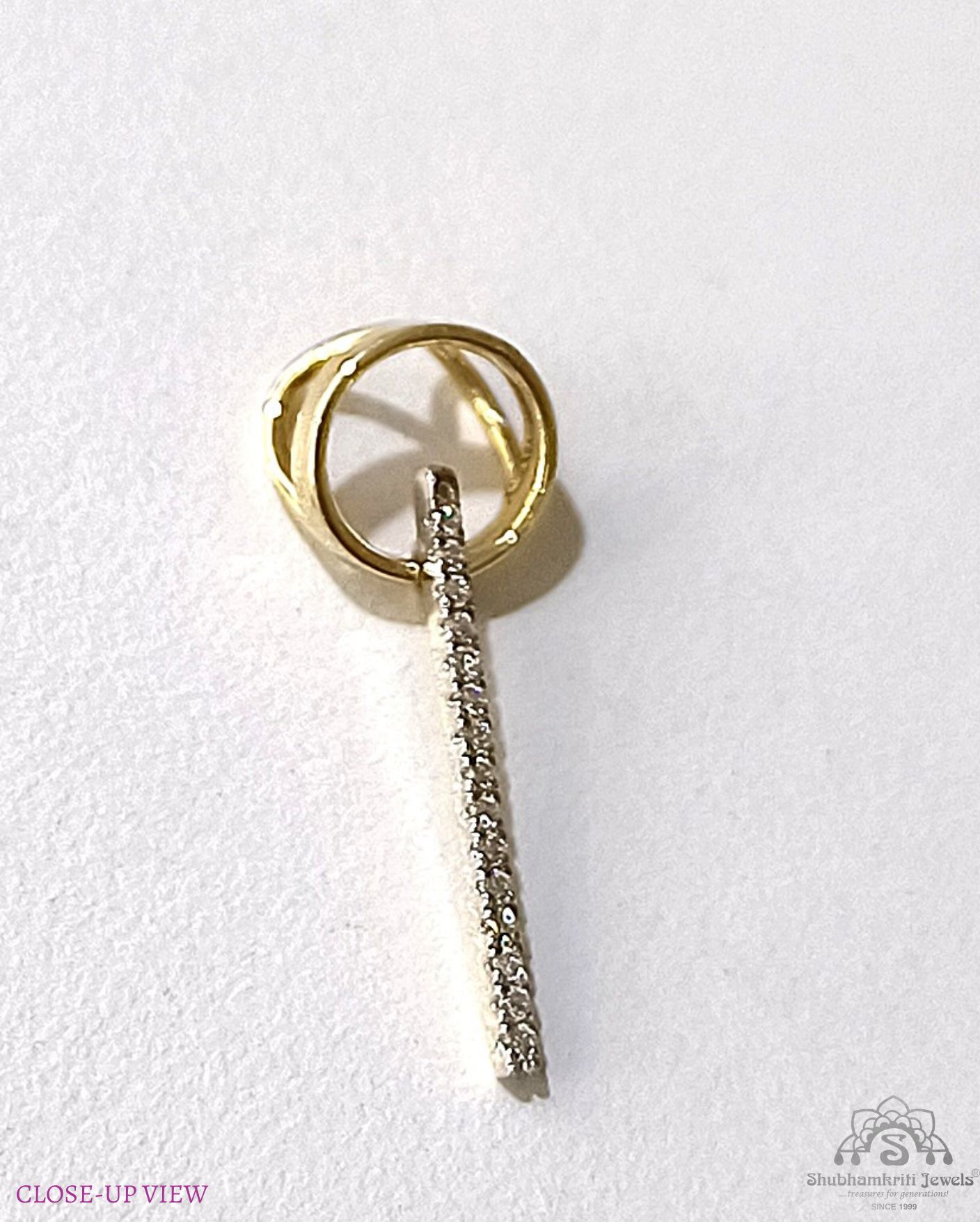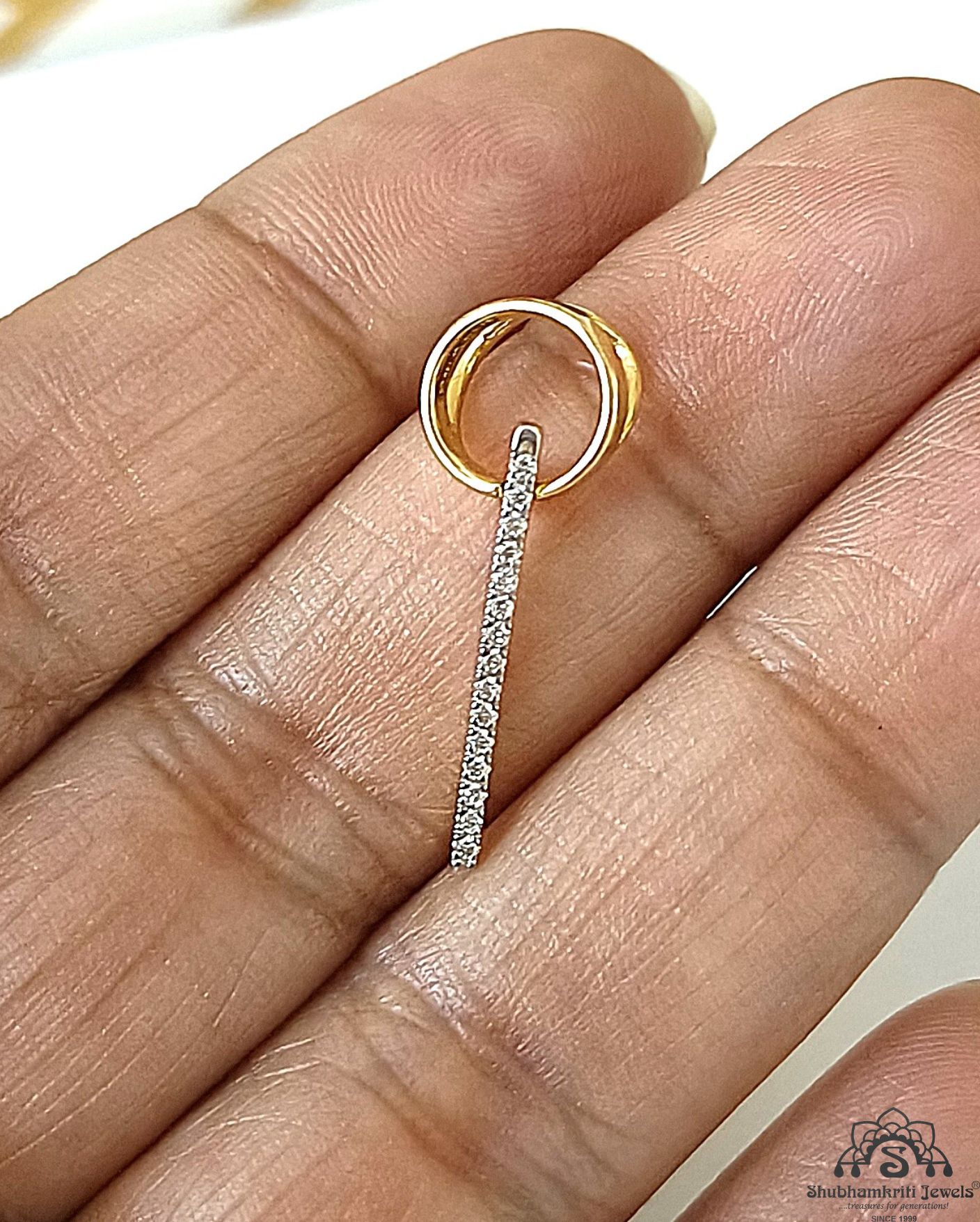 Elevate your style with this uniquely crafted 18K gold diamond stick pendant from Shubhamkriti Jewels. Designed for those who appreciate contemporary minimalism, this pendant features a sleek bar adorned with dazzling diamonds, gracefully suspended from an artistic gold loop. Perfect for everyday wear or special occasions, this sophisticated piece adds a touch of brilliance to any ensemble. Shop now and embrace timeless elegance