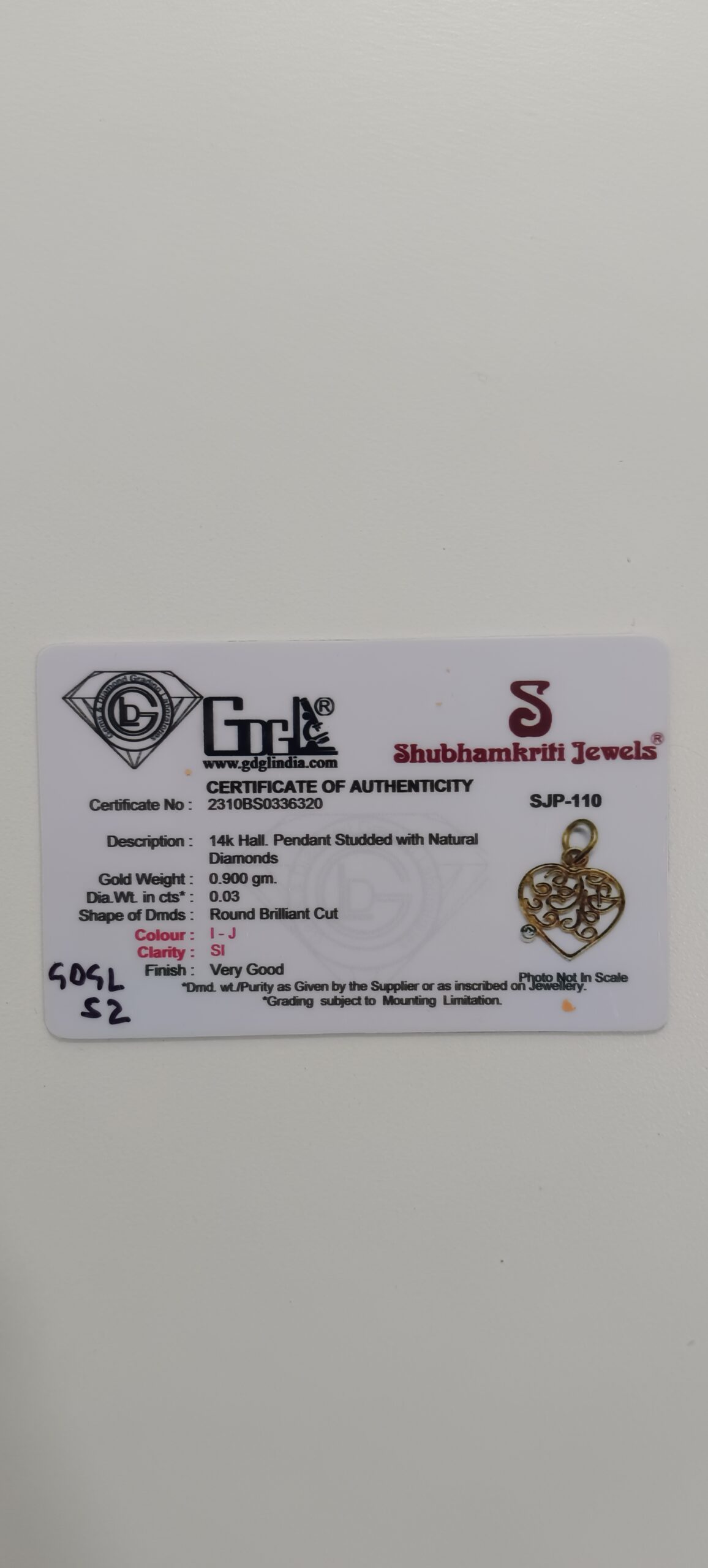 Its 14k Hallmarked Pendant studded with natural Diamonds certified by GDGL (GEMS AND DIAMOND GRADING LABORATORIES)